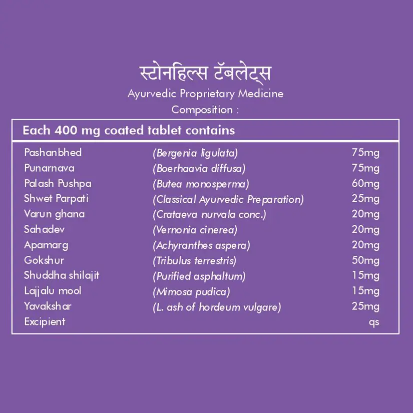 Stonhills is an Ayurvedic formulation of Pashanbhed, Punarnava, Palash Pushpa, Gokshur and Yavashar. It may have electrolyte balancing, detoxifying, analgesic, antioxidant and revitalizing properties.